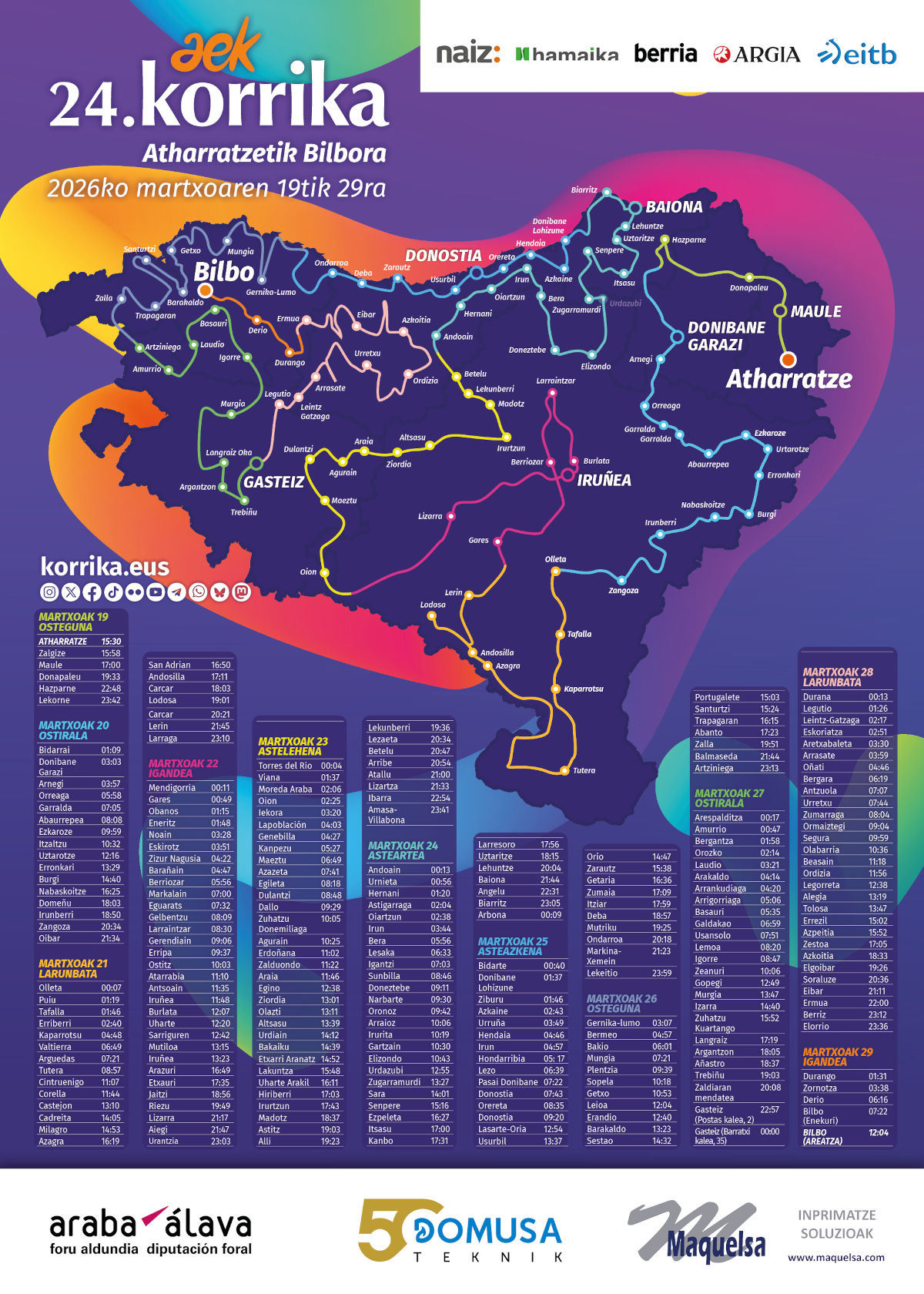 Hiriburuen artean, Maule bisitatuko du lehendabizi Korrikak: Atharratzetik atera eta 16:45ean helduko da horra. Donibane Garazin, ordea, martxoaren 20an, ostiralarekin, izango da, gaueko ordu txikietan (02:50ean).
