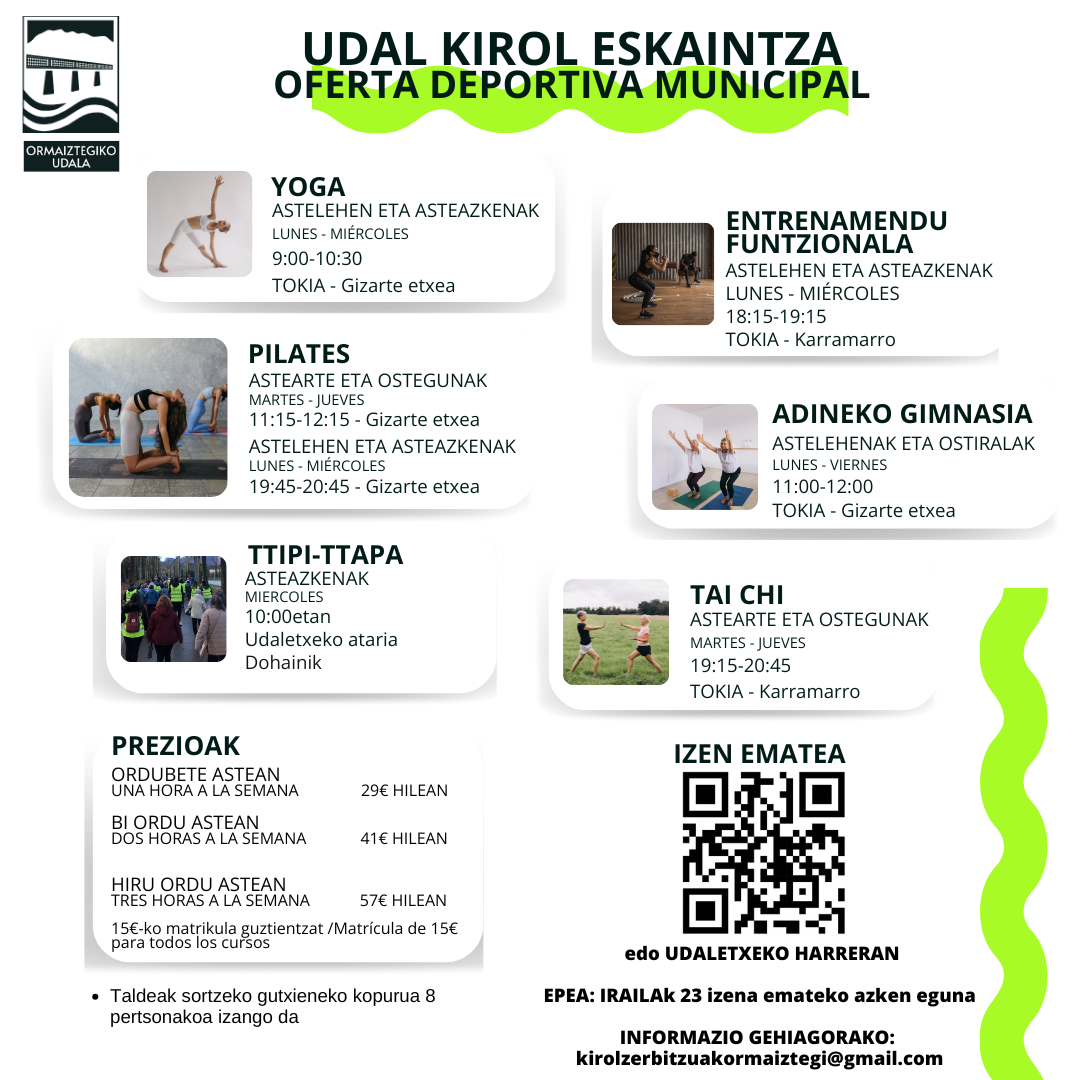 Inscripción: descargar el documento "hoja de inscripción cursos deportivos", rellenarlo y presentarlo a través de los Servicios Electrónicos o presencialmente en las oficinas municipales en horario de oficina.
